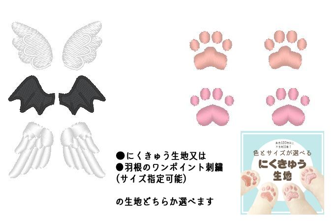 ●肉球・又は羽根などのワンポイント刺繍が入れられます(同色生地以外もOK)