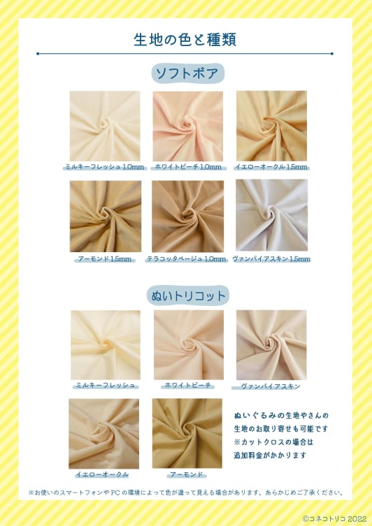 ・画像の生地リストにない色の生地をご希望の場合はご相談ください。ぬいぐるみの生地やさん https://shop.nuigurumi-fabric.com/ で販売中の生地であればお取り寄せ可能です。お客様が用意された生地への刺繍はできません。