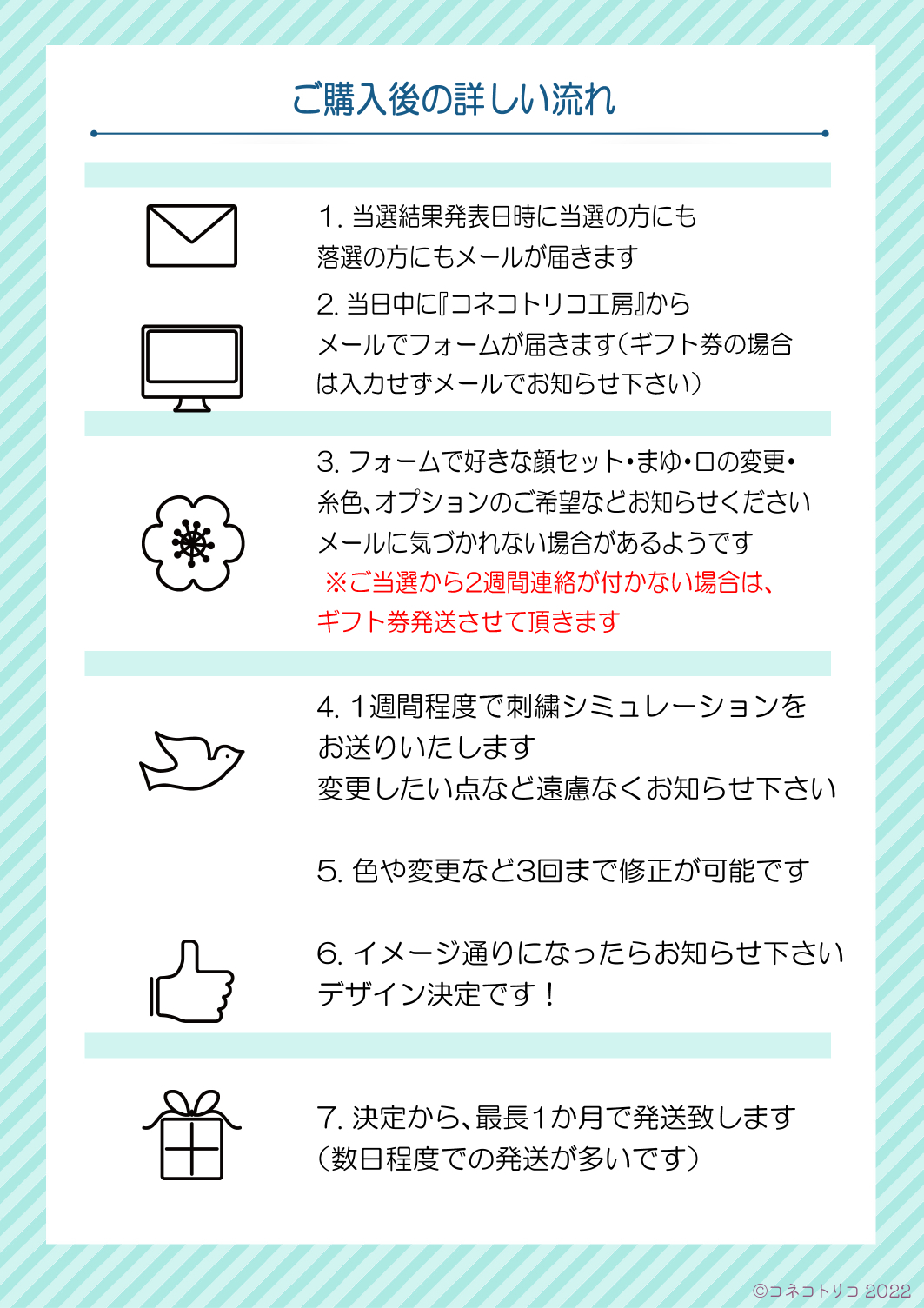 (全くお返事いただけない場合はギフト券発送(同じ商品の〆切が到着から4か月有効期限のギフト券で内容は全く同じです)を、着手後に2週間ご連絡がない場合はその時点の最新のお顔でお作りして発送させていただきます)