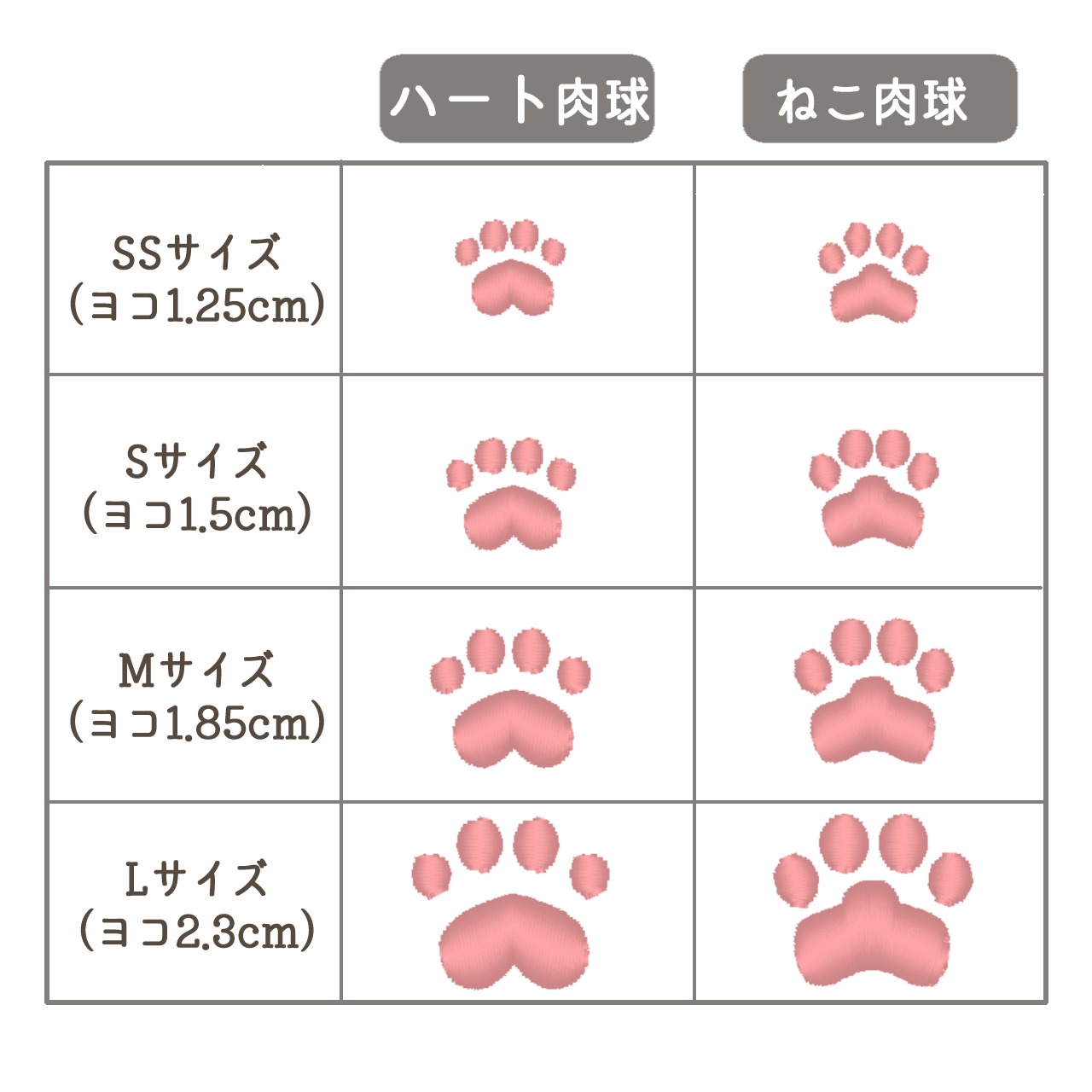・糸の太さと針数の関係上、同じデザインでもサイズを小さくすると細かな部分の再現度が下がったり、細さに限界があるため、細い線の印象が変わる場合があります。