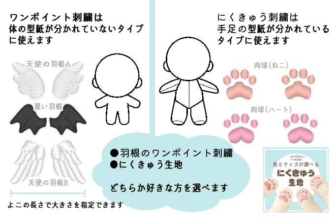 肉球刺しゅう(4つ)・又はワンポイント刺繍1点(羽根左右1組)