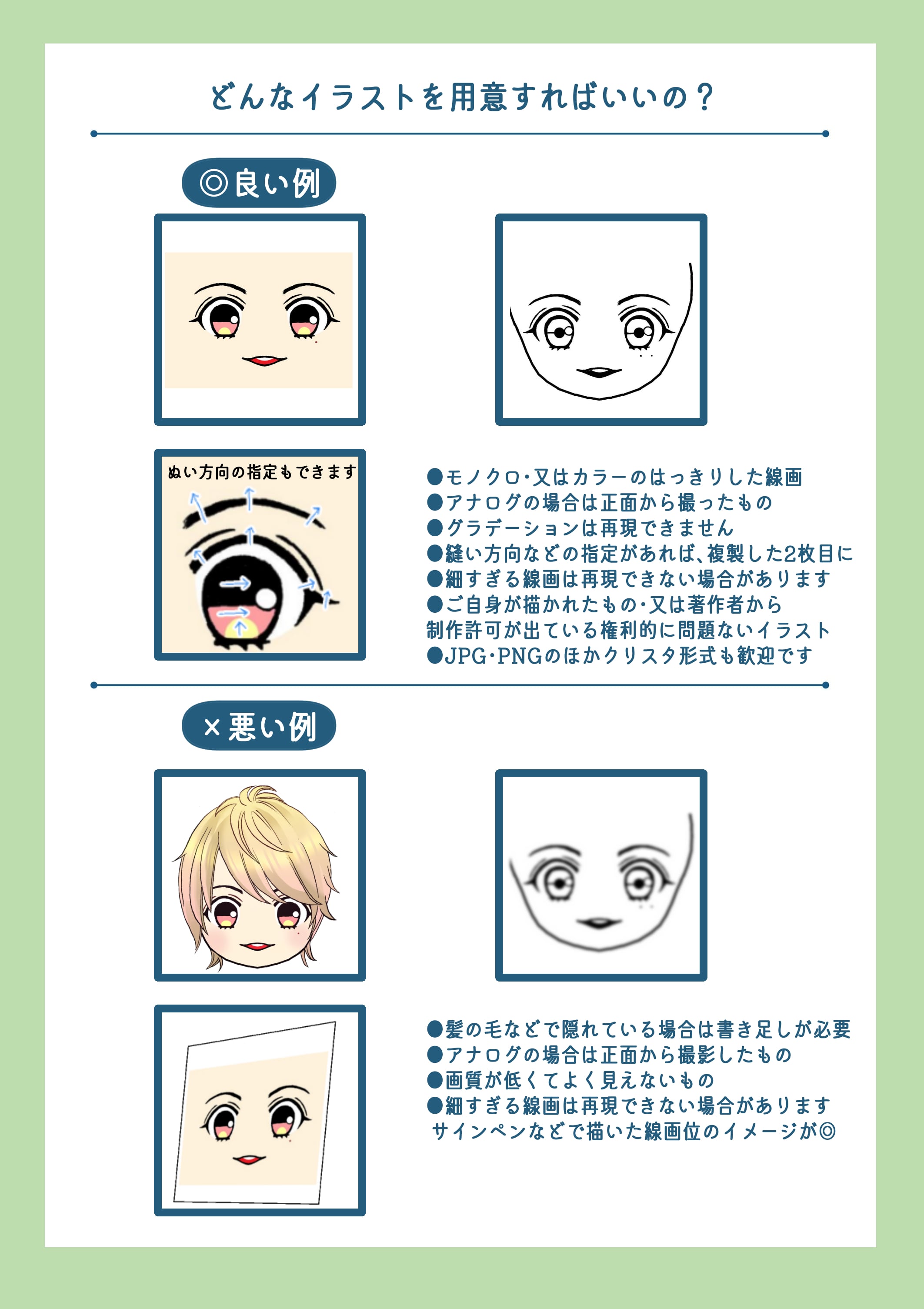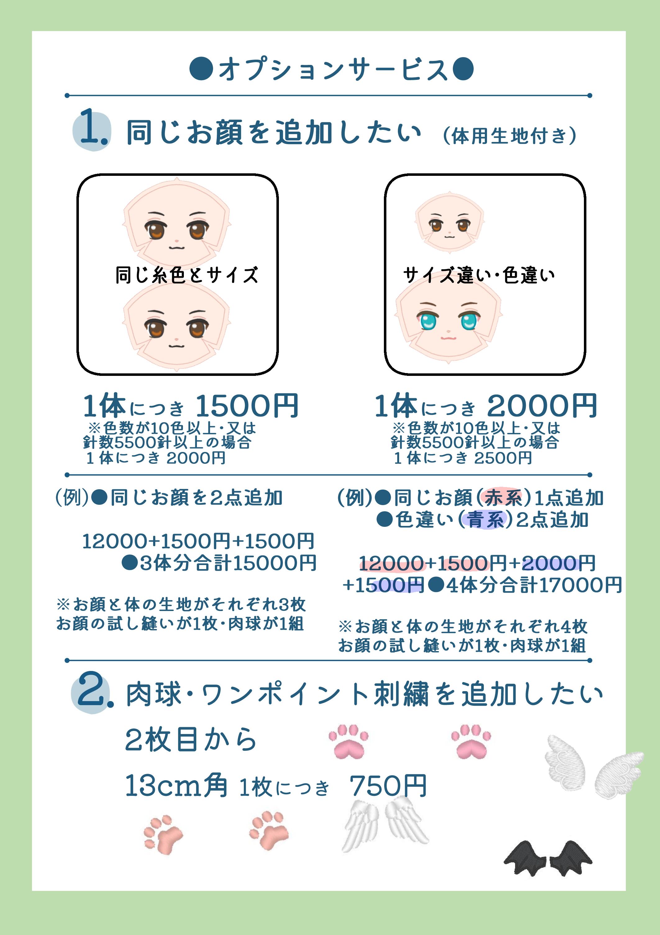 ・『ぬいのお顔刺しゅうフルオーダー』のご利用は『完全オリジナルイラスト』または友人に書いてもらったなど『権利者の許可を得たイラスト』に限ります。