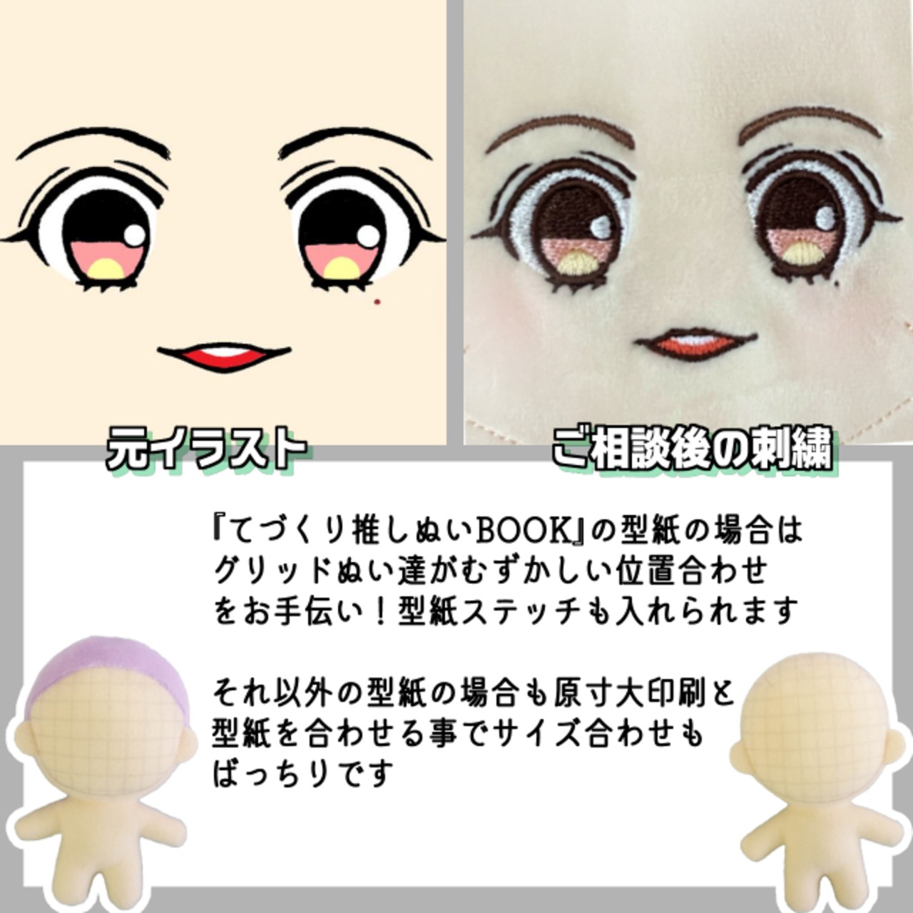 ●てづくり推しぬいBOOKの型紙に合わせたグリッドぬいたちが難しい位置合わせをお手伝い!推しぬいBOOKやなないろちゃん、wawaちゃんnunuちゃんのお顔の型紙ステッチも相談しながら入れられます