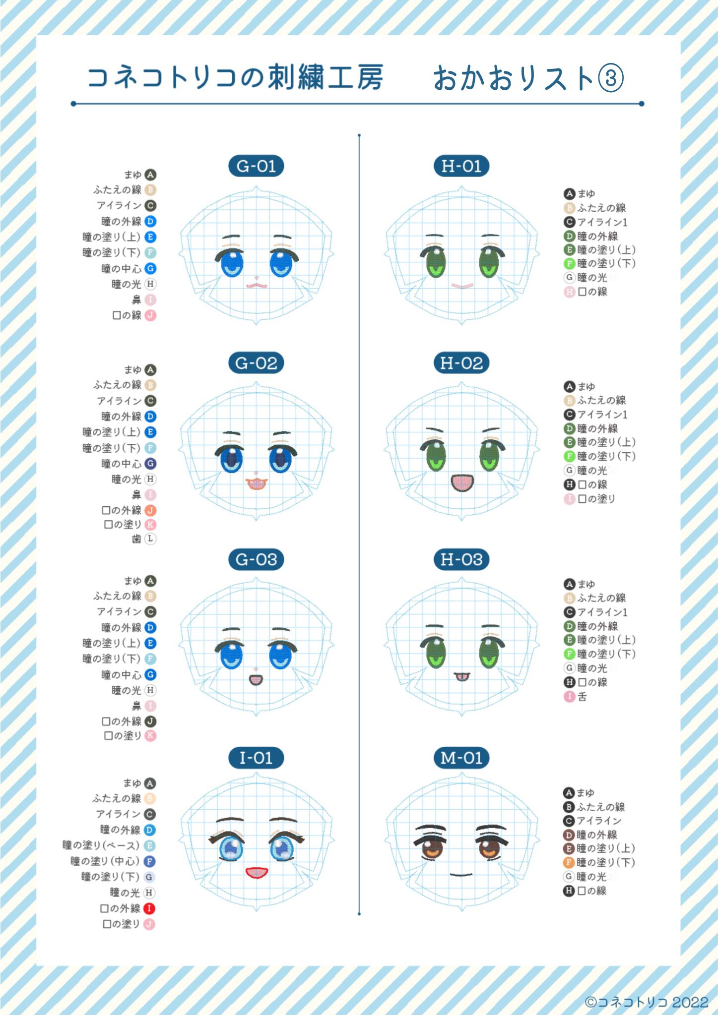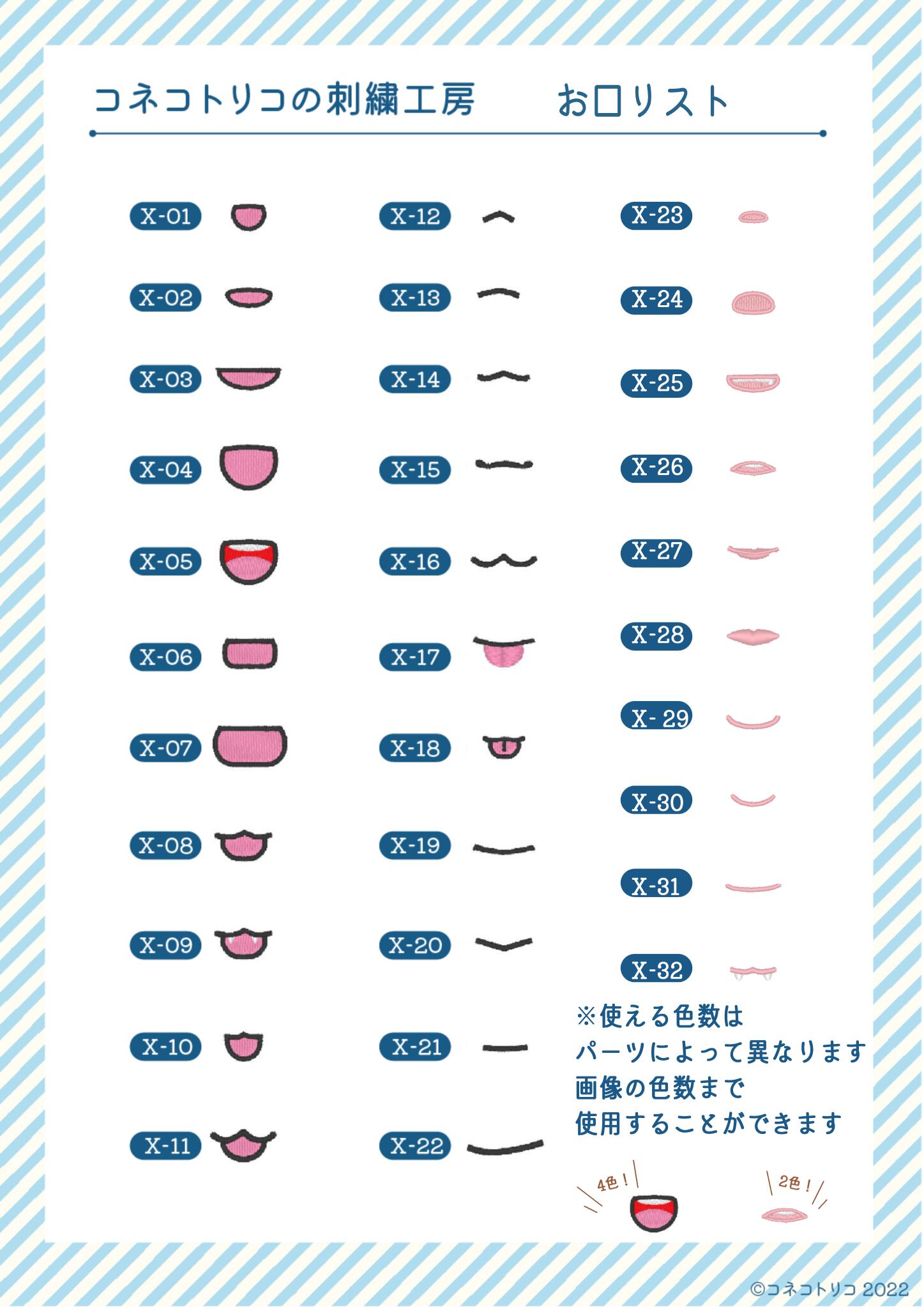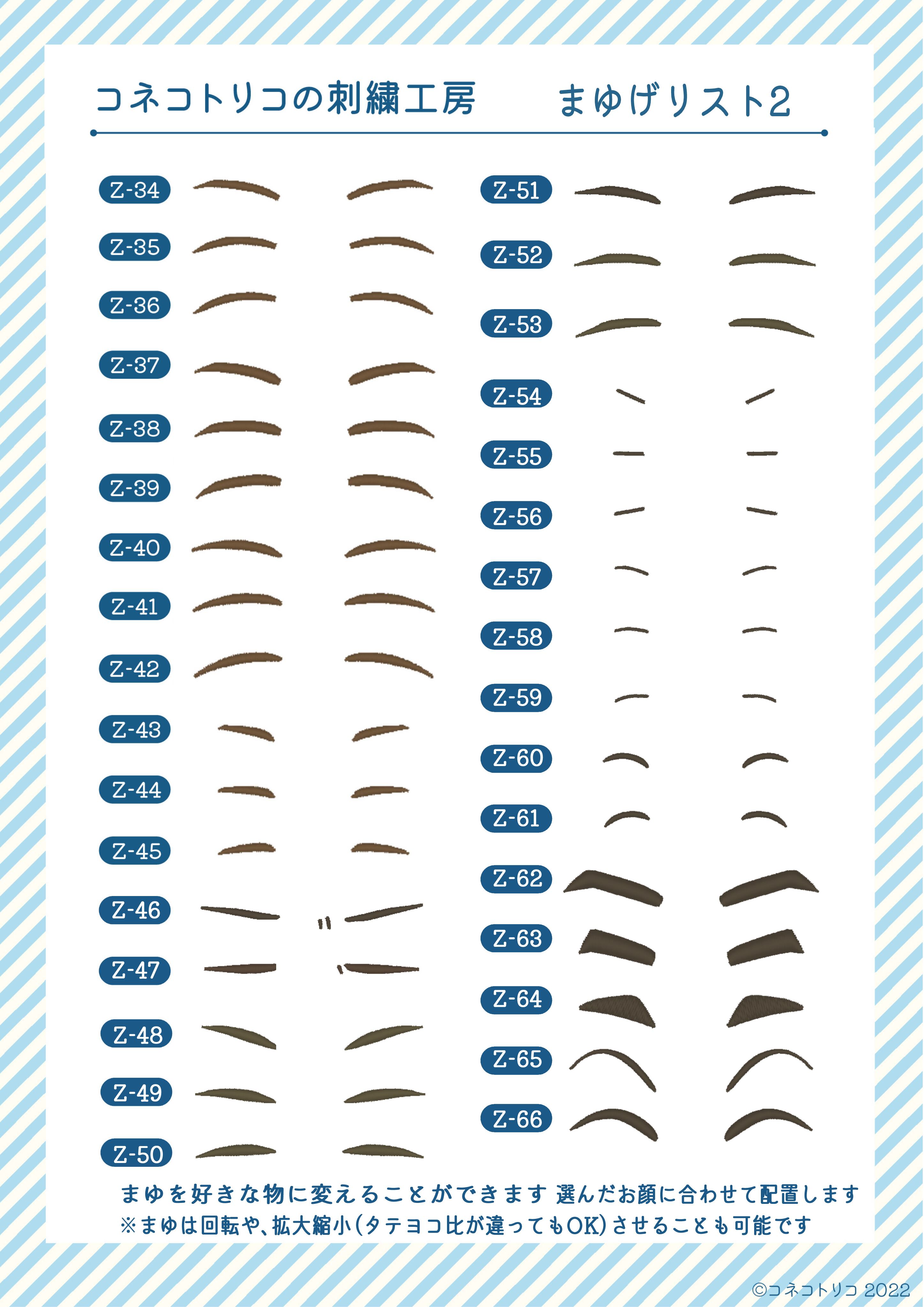 ・口、まゆげはオプションパーツ一覧の中からお好きなものに変更可能です。