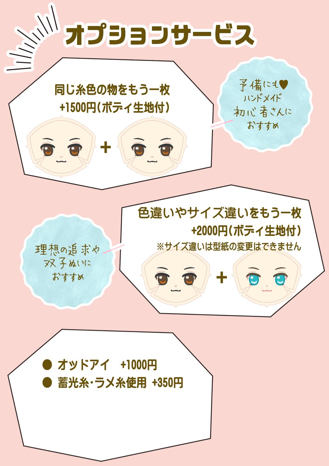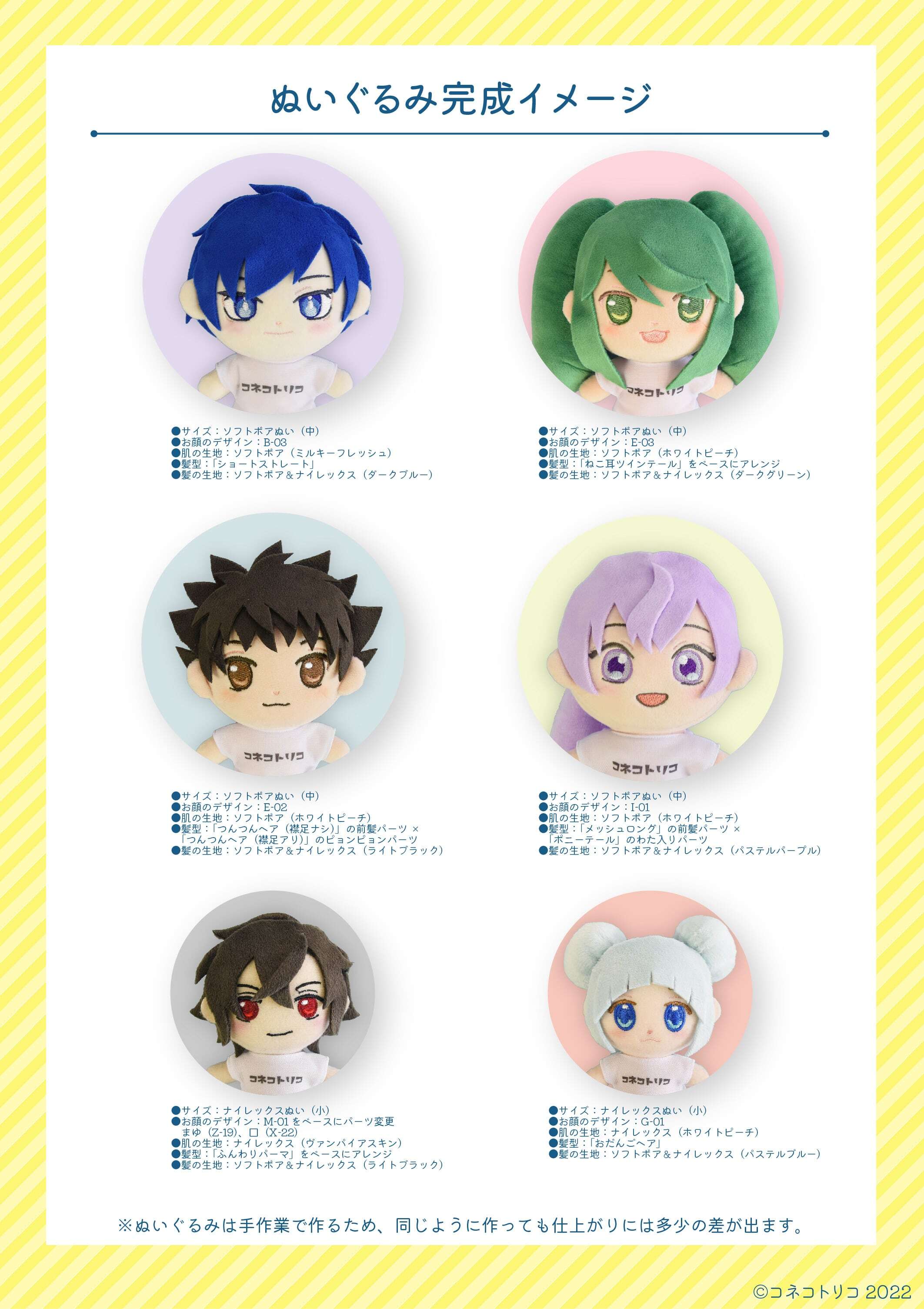 1.ベースの顔のデザインと、糸の色・生地色・ぬいのサイズ(大・中・小・又はオリジナルサイズ)を選んでお知らせください