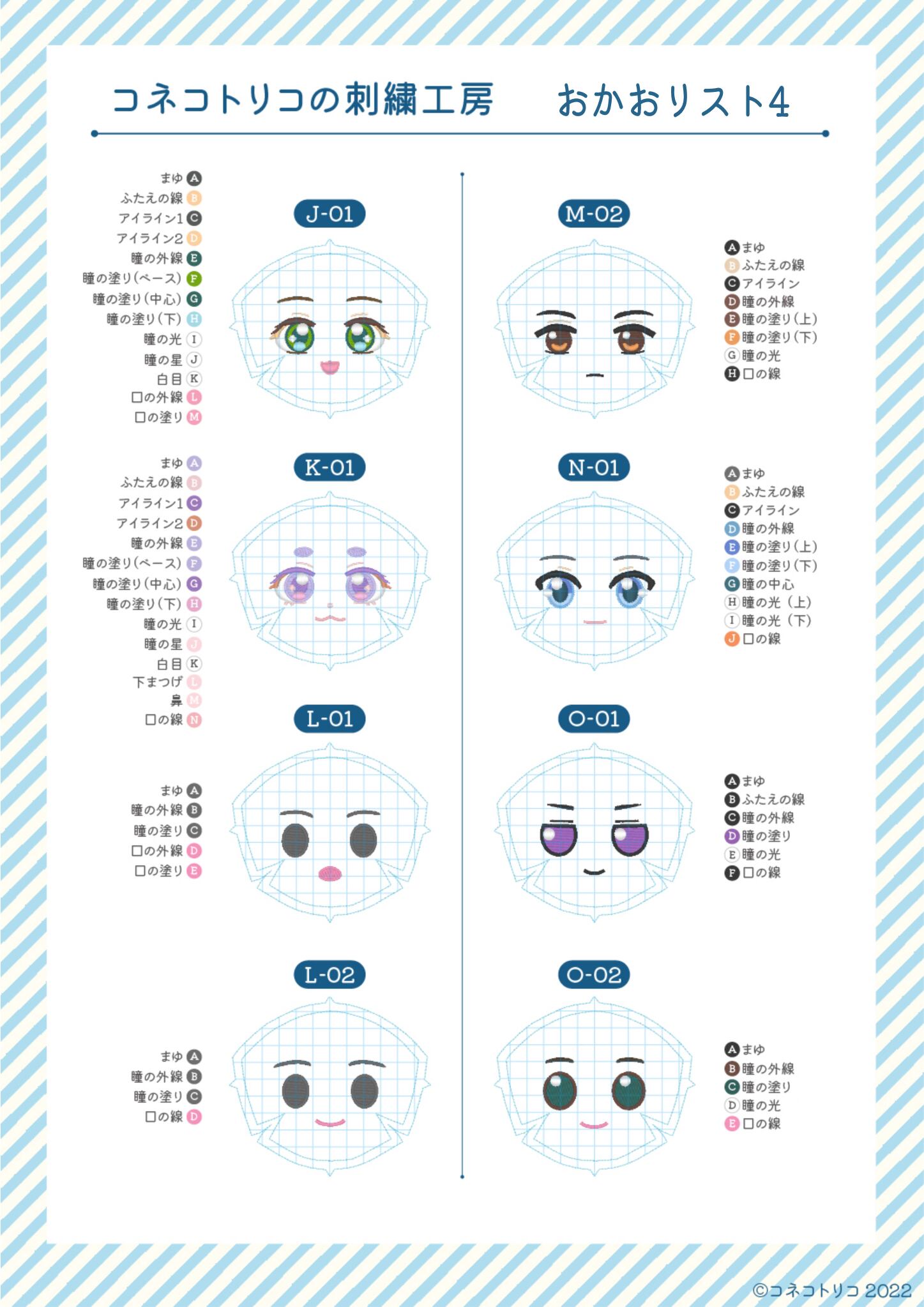 『てづくり推しぬいBOOK』の型紙で作ったときにちょうどいいバランスになるようにお顔のパーツ配置を調整してあり、お顔の型紙ステッチを入れることもできます
