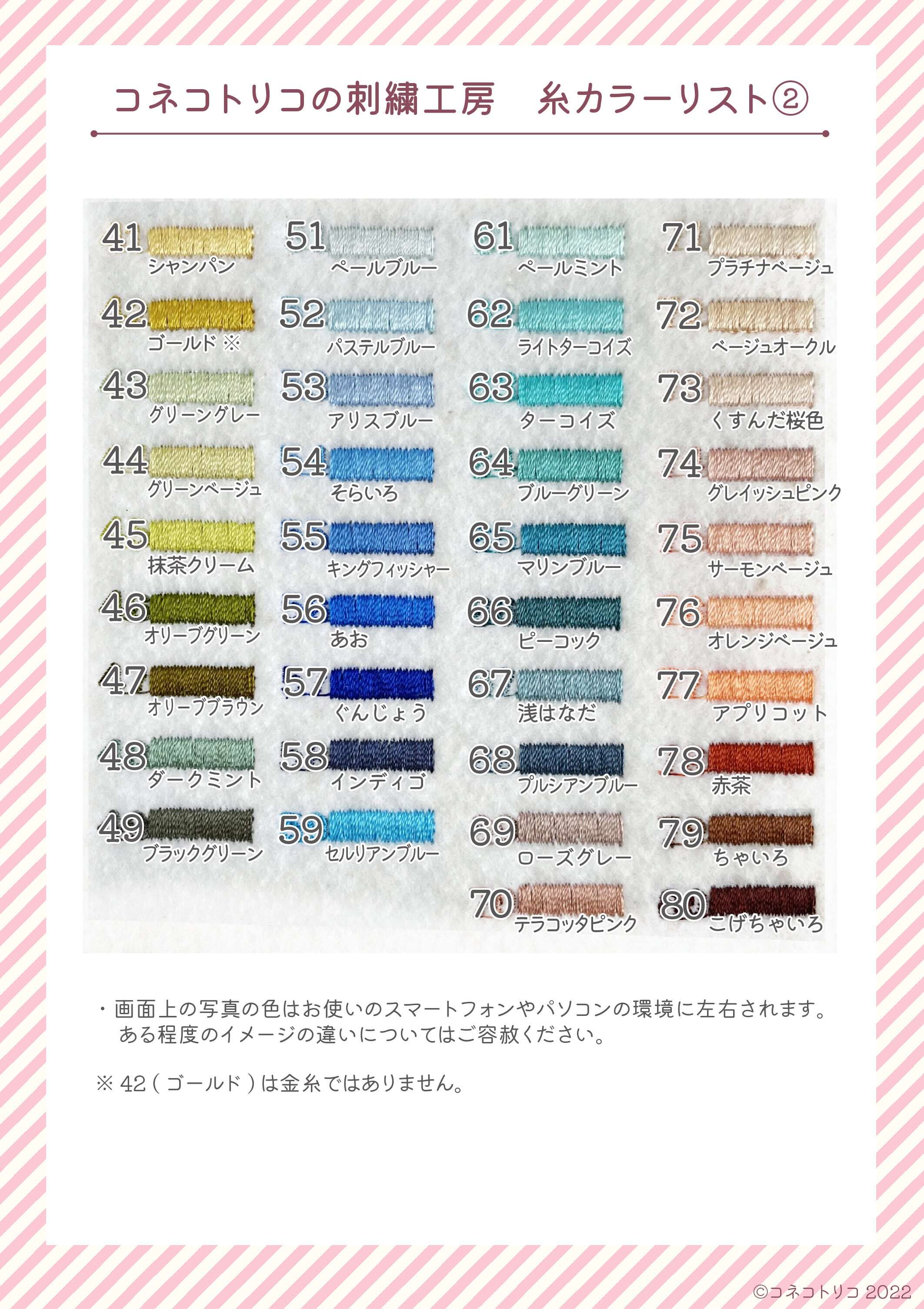 ※色の選択はカートに入れた後、購入時の備考欄に希望の糸色番号をご記入ください